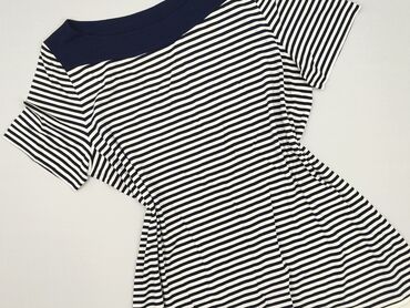 Sukienka w paski, granatowo-biała. - Krój: prosta, dopasowana do sylwetki, długość midi/przed kolano - Dekolt: kwadratowy - Rękaw: krótki, lekko poszerzany - Wzór: nieregularne, poziome paski w od...