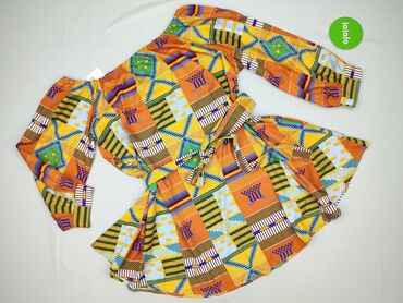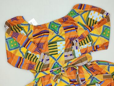 Sukienka damska z krótkim rękawem, rozmiar 44. - Fason: dopasowany, długość midi/przed kolano, okrągły dekolt. - Wzór: etniczne/geometryczne pasy i motywy tribal w odcieniach beżu, granatu, błęki...