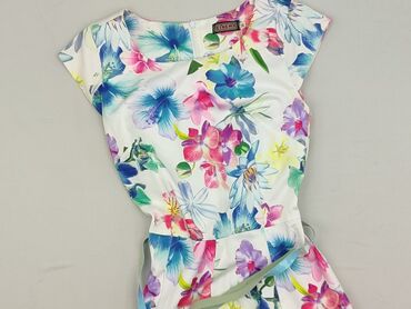 Sukienka ELHEMA w kwiaty - Krój: taliowana góra, rozkloszowany dół z zaszewkami; długość midi - Dekolt: łagodnie zaokrąglony - Rękawy: krótkie - Zapięcie: kryty zamek z tyłu - Materiał: gładki, śr...Stan: