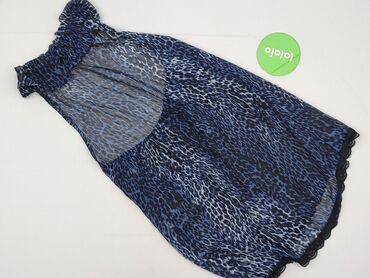 Długa sukienka damska Amy's Paris w rozmiarze 12 (UK), co odpowiada rozmiarowi 40 (EU). Sukienka ma czarno-niebieski wzór w panterkę i jest ozdobiona w pasie czarnymi, fasetowanymi koralikami. Posi...