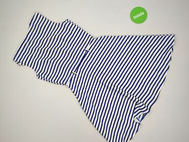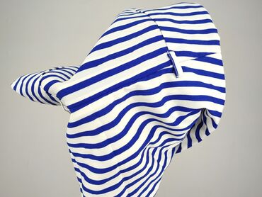 Sukienka w paski, granatowo-biała. - Krój: prosta, dopasowana do sylwetki, długość midi/przed kolano - Dekolt: kwadratowy - Rękaw: krótki, lekko poszerzany - Wzór: nieregularne, poziome paski w od...