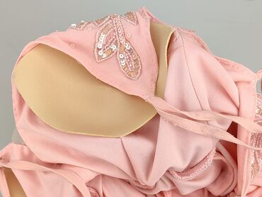 Jasnoróżowa sukienka wieczorowa z błyszczącego, satynowego materiału z koronkowymi wstawkami. Posiada zabudowany dekolt oraz zapięcie na zamek błyskawiczny z tyłu, co ułatwia zakładanie. Rękawy są ...