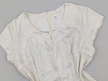 Elegancka sukienka ołówkowa w kolorze złamanej bieli/ecru z delikatnym, żakardowym wzorem. - Krój: dopasowany, midi (za kolano), z modelującymi przeszyciami. - Rękaw: krótki. - Dekolt: półokrągł...Stan: