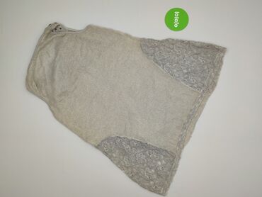 Bez rękawówSukienka/tunika damska bez rękawów, jasnoszara, o nieco asymetrycznym kroju. Model patchworkowy: połączenie dzianiny o różnej fakturze (gładka i siateczkowa) z wstawkami z koronką w kolorze szarości. Z przodu dekoracyjna duża koronkowa kokarda na prawym boku oraz koronkowe kliny przy dole. Na lewym ramieniu zapięcie na kilka kolorowych guzików (ułatwia zakładanie i stanowi ozdobę). Okrągły dekolt, obszycia w kolorze materiału. Lekka, miękka, przewiewna dzianina – idealna na lato lub do warstwowych stylizacji. Tył gładki z koronkowymi wstawkami przy dole i na boku. Kolorystyka neutralna, łatwa do łączenia z dodatkami. Przybliżona długość: do połowy uda (w zależności od wzrostu).