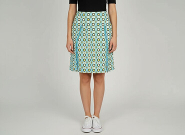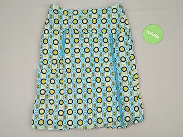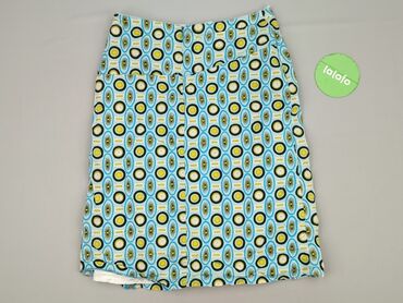 Spódnica damska w niebieskim kolorze z kwiecistym wzorem. Charakteryzuje się wzorem z pomarańczowymi, żółtymi i zielonymi elementami, co nadaje jej świeży i letni wygląd. Spódnica ma fason kopertow...