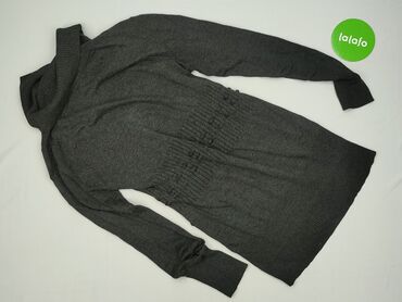 Szara dzianinowa sukienka/sweter z falbanami - Fason: dopasowana w górnej części, rozkloszowana ku dołowi; długie rękawy. - Dekolt: kopertowy V z szeroką, marszczoną falbaną wokół kołnierza. - Dod...