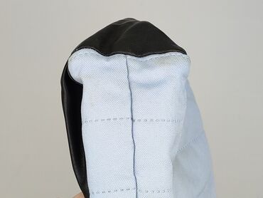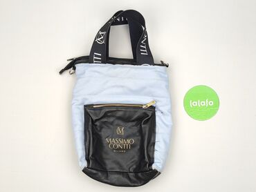 - Materiał: połączenie tkaniny w kolorze jasnoniebieskim (pikowana) oraz czarnej skóry ekologicznej z przodu i na spodzie