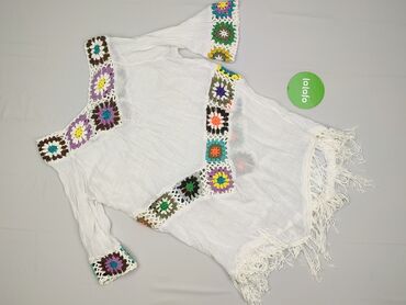 Bluzka boho z haftem szydełkowym - Materiał: lekka, przewiewna tkanina w kolorze białym - Fason: luźny, z krótkim rękawem - Dekolt: ozdobny kołnierz szydełkowy w kształcie litery U/V, z motywem kw...Stan:
