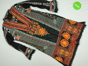 Na co dzieńDamska tunika w rozmiarze M/L, charakteryzująca się bogatym, etnicznym wzornictwem. Tunika ma długie rękawy i rozkloszowany dół, dodający swobody. Ozdobiona jest koronkowymi detalami na mankietach i dole, co nadaje jej delikatności. Dominujące kolory to czerń, pomarańcz, czerwień i żółć, tworzące wyrazisty kontrast. Dekolt w kształcie litery V, wzbogacony haftem, podkreśla styl tuniki. Idealna do noszenia na co dzień, na specjalne okazje, a także jako element letniej garderoby.