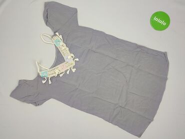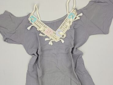 Tunika damska w kolorze jasnoszarym/niebieskawym, z dekoracyjną koronkową wstawką na przodzie w odcieniu lawendowym. - Krój prosty, długość za biodra/mini sukienka - Rękaw 3/4 - Okrągły dekolt ...Stan: