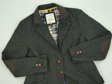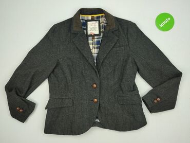 Żakiet damski F&F - Kolor: ciemnoszary w drobny prążek - Krój: klasyczny, taliowany; klapy w szpic (notch lapel) - Zapięcie: 2 guziki z przodu; na mankietach ozdobne guziki - Kieszenie: dwie przed...
