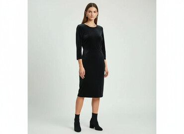 Czarna welurowa sukienka z długim rękawem - Materiał: miękki, elastyczny welur o subtelnym połysku - Kolor: głęboka czerń - Krój: dopasowana góra i rozkloszowany, falujący dół - Długość: midi do d...