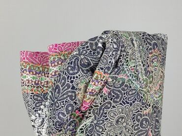 Tkanina: żakard o wyraźnej fakturze, wielobarwny wzór kwiatowo‑paisley. Dominują granat i biel z akcentami zieleni, różu, pomarańczu i fioletu. Ozdobne, bordiury przy mankietach i na dole sukienki w odcieniach różu.