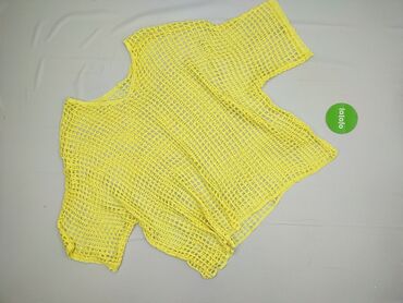 Ażurowy sweter damski – kolor pastelowa żółć. - Krój: luźny, lekko skrócony (crop), proste ramiona. - Dekolt: łagodnie łódkowy. - Rękawy: 3/4, szerokie. - Splot: otwarty, ażurowy z regularnymi ocz...Stan: