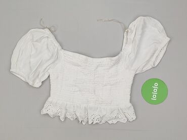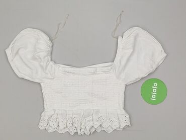 Bluzka crop top RB Sister – rozmiar M - Krój: krótki, dopasowany dzięki szerokiemu pasowi z marszczeniem (smock) w talii - Dekolt: głęboki, z krótką wiązaną tasiemką pośrodku - Rękawy: krótkie, le...