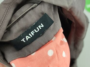 Damski blazer marki Taifun w kolorze szarym, charakteryzujący się eleganckim krojem. Posiada klapy i zapięcie na guziki z przodu. Wewnętrzna podszewka, widoczna na części zdjęć, jest w kolorze łososiowym w białe kropki, co dodaje mu unikalnego charakteru. Długie rękawy można podwinąć, co zapewnia wszechstronność w stylizacji. Idealny do noszenia na co dzień, jak i na specjalne okazje, dodając elegancji każdej stylizacji.