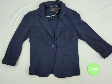Granatowa marynarka damska - Klasyczny, taliowany fason z klapami - Zapinana na jeden guzik (kontrastowy, jasny) - Długi rękaw; możliwość podwinięcia mankietów z delikatną, prążkowaną wstawką wewn...