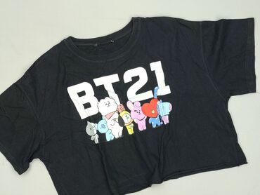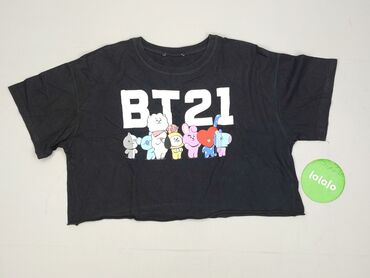 Czarny krótki top damski z marszczeniem - Fason: crop top z dekoltem w kształcie serka/square, krótszy krój - Rękawy: krótkie, lekko bufiaste, z elastycznymi gumkami przy ramionach - Przód: dekora...Koszulka damska crop top BT21