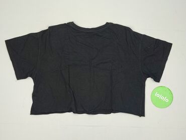 Czarna koszulka damska typu crop top - Krój: krótki (crop), dopasowany, z krótkim rękawem - Dekolt: okrągły - Kolor: czarny, gładki bez nadruków - Rozmiar z metki: L - Skład materiału: 95% poliest...