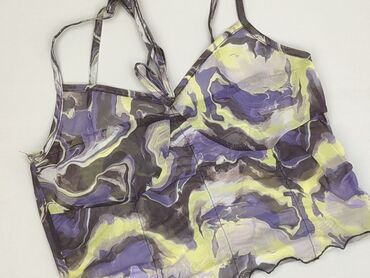 Bluzka damska HOUSE BRAND, rozmiar XS. - Krótki fason (crop top) z krótkim rękawem - Dzianina prążkowana w kolorze intensywnego różu - Dekoracyjne, kontrastowe szwy i falbankowe wykończenia w żó...Ten damski crop top marki House Brand w rozmiarze M wyróżnia się wzorem marmurkowym w odcieniach fioletu, żółci i szarości. Posiada wiązane ramiączka na szyi, co dodaje mu stylu halter neck, oraz cienkie ramiączka na ramionach. Dół topu jest wykończony falbanką, co nadaje mu lekkości i dziewczęcego charakteru. Materiał jest półprzezroczysty, idealny na cieplejsze dni.