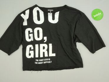 Top damski H&M Divided - Model: czarny crop top z nadrukiem „TOKYO 58” z przodu - Krój: szerokie, opadające rękawy (bez klasycznych szwów na ramionach), skrócona długość - Rozmiar z metki: EU S (U...Czarna koszulka damska typu crop top z krótkim rękawem 3/4. Na przodzie duży biały nadruk: „YOU GO, GIRL” oraz mniejszy napis: „THE FIRST STEP IS THE MOST DIFFICULT”. Luźny, lekko oversize’owy krój, okrągły dekolt. Dół z surowym wykończeniem. Rozmiar z metki: 38. Marka: INWASH. Idealna do stylizacji casual i streetwear. Kolor: czarny z białym nadrukiem. Materiał: bawełna (miękka dzianina).