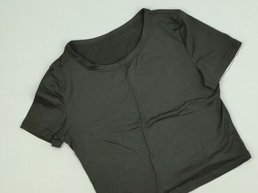 Czarna koszulka damska typu crop top - Krój: krótki (crop), dopasowany, z krótkim rękawem - Dekolt: okrągły - Kolor: czarny, gładki bez nadruków - Rozmiar z metki: L - Skład materiału: 95% poliest...