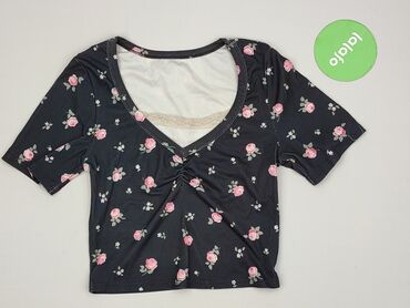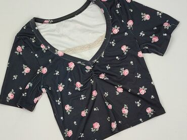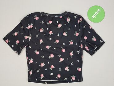 Bluzka damska z krótkim rękawem, w kwiatowy wzór - Rozmiar: S (EU 36, US 4) – na metce - Materiał: 100% poliester - Kolor: czarne tło z pastelowym, różowo-zielonym motywem kwiatowym - Krój: lekko ...