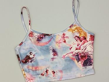 Top damski na ramiączkach, rozmiar S. - Krój: krótki crop top z marszczeniami po bokach, na szerokich, półprzezroczystych ramiączkach. - Wzór/kolor: różowy akwarelowy/roślinny motyw (róże). - Ma...