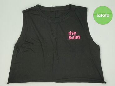Czarny krótki top damski (crop top) z krótkim rękawem. - Fason: dopasowany, długość do talii - Dekolt: okrągły - Rękaw: krótki, klasyczny - Materiał: gładki, elastyczny i miękki w dotyku (syntetyc...Czarny damski crop top bez rękawów Shesay, rozmiar L.