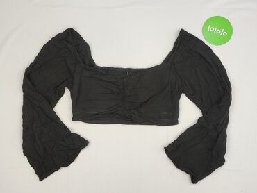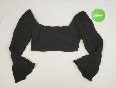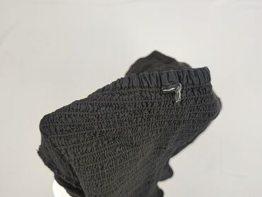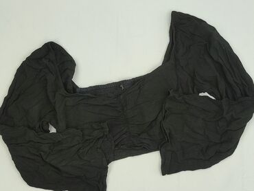 Czarna bluzka/krótki top z marszczonej, miękkiej tkaniny (gofrowana bawełna/gaza). - Krój: hiszpański/odsłonięte ramiona lub na ramionach (gumka w dekolcie). - Krótkie, bufiaste rękawki z gumką. ...