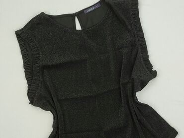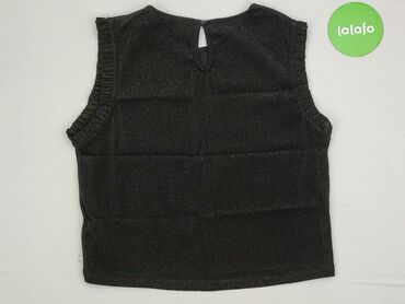 Czarna bluzka bez rękawów z lekkiej, półtransparentnej tkaniny. Krój prosty, z zaokrąglonym dekoltem z przodu. Tył ozdobiony szerokim pasem cekinów przy karku, co dodaje blasku i sprawia, że top na...