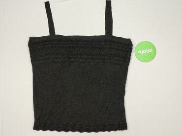 Czarny top na ramiączkach - Krój: luźny, prosty, z delikatnym dekoltem w kształcie litery V z przodu; tył gładki, lekko marszczony u góry. - Ramiączka: wąskie. - Materiał: miękki, ażurowy/koronkow...Stan: