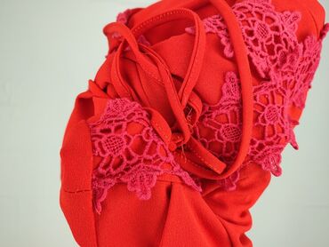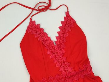 Czerwony kombinezon damski z koronką - Krój: krótki kombinezon z rozkloszowaną, plisowaną częścią dolną (efekt spódniczki) - Dekolt: głęboki V z przodu, ozdobiony ażurową koronką z motywem kwiatow...