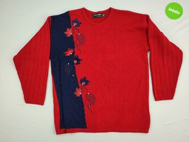 OkrągłyCzerwony sweter damski z długim rękawem, ozdobiony granatowym panelem z haftowanymi motywami liści i winogron. Panel biegnie pionowo z przodu swetra po lewej stronie. Rękawy i tył swetra posiadają prążkowaną fakturę, dodającą mu tekstury. Okrągły dekolt zapewnia klasyczny wygląd. Sweter jest w rozmiarze uniwersalnym, co sprawia, że jest łatwy w dopasowaniu.