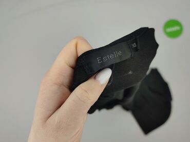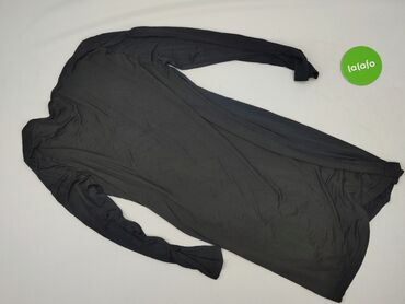 Czarny kardigan damski bez zapięcia, rozm. L/XL. - Fason: lekko wydłużony, z długim rękawem, otwarty przód. - Dekolt: okrągły, ozdobny pasek z drobną lamówką i trzema dekoracyjnymi elementami przy...