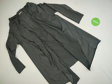 Długi kardigan damski, bez zapięcia, w kolorze ciemnoszarego melanżu. - Fason: swobodny, otwarty przód z szeroką listwą/kołnierzem; rękawy długie. Dół lekko wydłużony z tyłu, rozcięcia po bokach u...