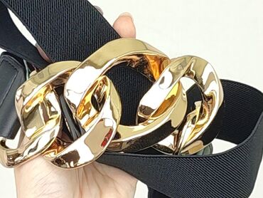 Szeroki pas elastyczny z ozdobą łańcuchową - Kolor: czarny pas, złota dekoracja z dużych ogniw - Materiał pasa: 70% poliester, 30% elastan – mocno elastyczny, dopasowuje się do sylwetki - Zapięcie...