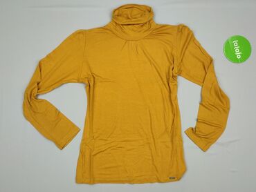 Żółty sweter damski z długimi rękawami i golfem. Dół swetra oraz mankiety są prążkowane, co zapewnia lepsze dopasowanie. Sweter wykonany jest z mieszanki wiskozy i poliestru, co zapewnia komfort no...