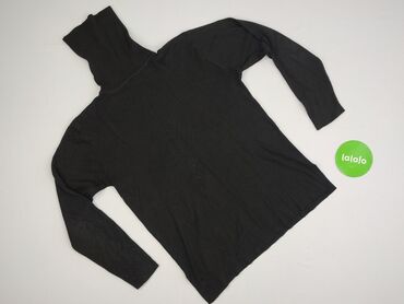 Czarny sweter damski z golfem - Krój: dopasowana góra z prążkowaną dzianiną, lekko rozszerzany dół - Rękawy: długie, zakończone ściągaczami - Dekolt: wysoki golf, miękki i elastyczny - Dzianina: p...