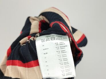 Bluzka damska w paski z golfem - Krój: dopasowany, krótki rękaw - Wzór: poziome paski w kolorze turkusowym na czarnym tle; paski z lekko wypukłą, fakturowaną nitką - Kołnierz: wysoki golf zapinany...