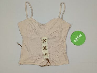 Beżowy top damski na ramiączkach - Krój: dopasowany, z delikatnym marszczeniem pod dekoltem - Dekolt: głęboki w kształcie litery V, wykończony koronką oraz subtelnymi, połyskującymi aplikacjami - ...