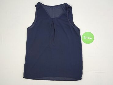 Damska bluzka bez rękawów w kolorze granatowym. Charakteryzuje się okrągłym dekoltem z rozcięciem w kształcie litery V, dodającym subtelnego akcentu. Bluzka wykonana jest z poliestru, co zapewnia j...Stan: