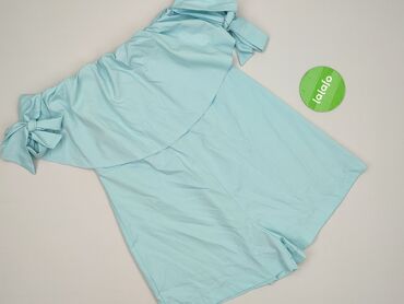 Jasnoniebieski kombinezon damski hiszpanka – OUZA - Fason: jednoczęściowy kombinezon z krótkimi nogawkami - Dekolt: hiszpański, odsłaniający ramiona, z falbaną dookoła - Talia: elastyczna gumka ze...