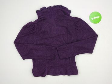 Fioletowy kardigan damski wykonany w 100% z akrylu. Charakteryzuje się unikalnymi, ozdobnymi aplikacjami na ramionach, które dodają mu elegancji. Długie rękawy i luźny krój zapewniają komfort nosze...Stan: