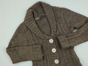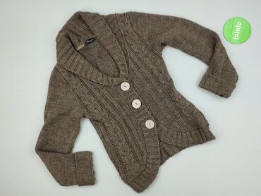 Kardigan damski w kolorze ecru/kremowym, dzianina o splocie warkoczowym. - Fason: otwarty kardigan bez zapięcia, z dekoracyjnymi patkami zapinanymi na dwa ozdobne guziki (złoty rant + perłowy środ...