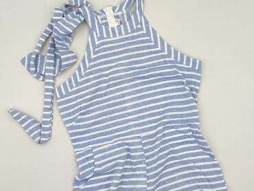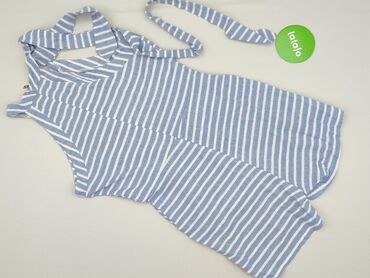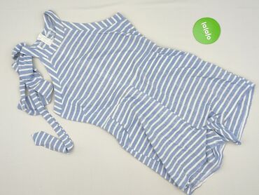 Niebiesko-biały kombinezon damski z krótkimi nogawkami, idealny na lato. Charakteryzuje się wzorem w paski i haftowanymi detalami, co nadaje mu unikalny wygląd. Posiada cienkie ramiączka i jest wyk...Stan: