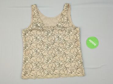 Bluzka damska bez rękawów, koronkowa, pudrowy róż, rozmiar M. - Fason: dopasowany top z delikatną baskinką. - Kolor: jasny, pudrowy róż. - Przód: bogato zdobiona, ażurowa koronka z motywem kwiatow...