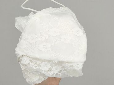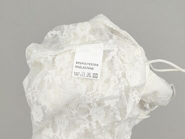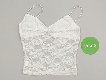 Biały top koronkowy na ramiączkach - Krótki, lekko prążkowany top z ażurowym wzorem w jodełkę - Ozdobna koronka wzdłuż dekoltu i ramiączek - Z przodu satynowa kokardka - Cienkie, podwójne ramiączk...