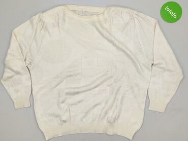 Sweter damski, dzianinowy, ecru/śmietankowy. - Fason: lekko skrócony, szeroki korpus, rękawy 3/4. - Splot: gruby, ażurowy, z wyraźnym warkoczowym wzorem z przodu i na rękawach. - Dekolt: szeroki, ...