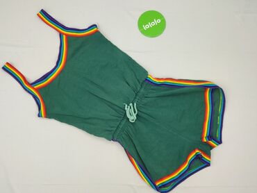 Kombinezon damski w kolorze zielonym z krótkimi spodenkami, idealny na lato. Posiada ramiączka oraz dekolt, a także boczne panele i wykończenia przy ramiączkach w tęczowe paski. W pasie regulowany sznurkiem, co zapewnia dopasowanie i wygodę. To stylowa i praktyczna opcja na ciepłe dni.